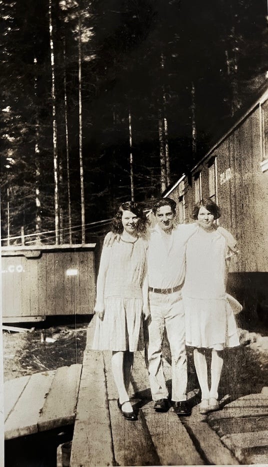 Three friends smiling. This photo is in “New Crystal Finish”, the photographic glossy paper finish available around this time. The back identifies Gerald Dowson, and Ruth possibly in a logging camp in the Pacific Northwest around the 1920s. It also has a stamp from The Owl Drug Co. in Lewiston, Idaho. “THE OWL DRUG CO, Lewiston, Idaho” opened in Lewiston in 1895. still operates today as The Owl Pharmacies in the Lewis-Clark Valley.