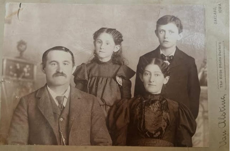 The photograph of this family in Victorian apparel. It was taken by “Van Alstine, The Elite Photo Parlors” which was located in Oakland, Iowa. The picture is sepia tone, on the cardstock, some fading.